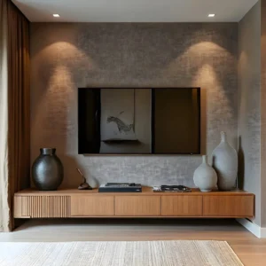 Invest in TV consoles and wall units that include built-in cable management systems or concealed shelves. This keeps your living room organized and visually clean.