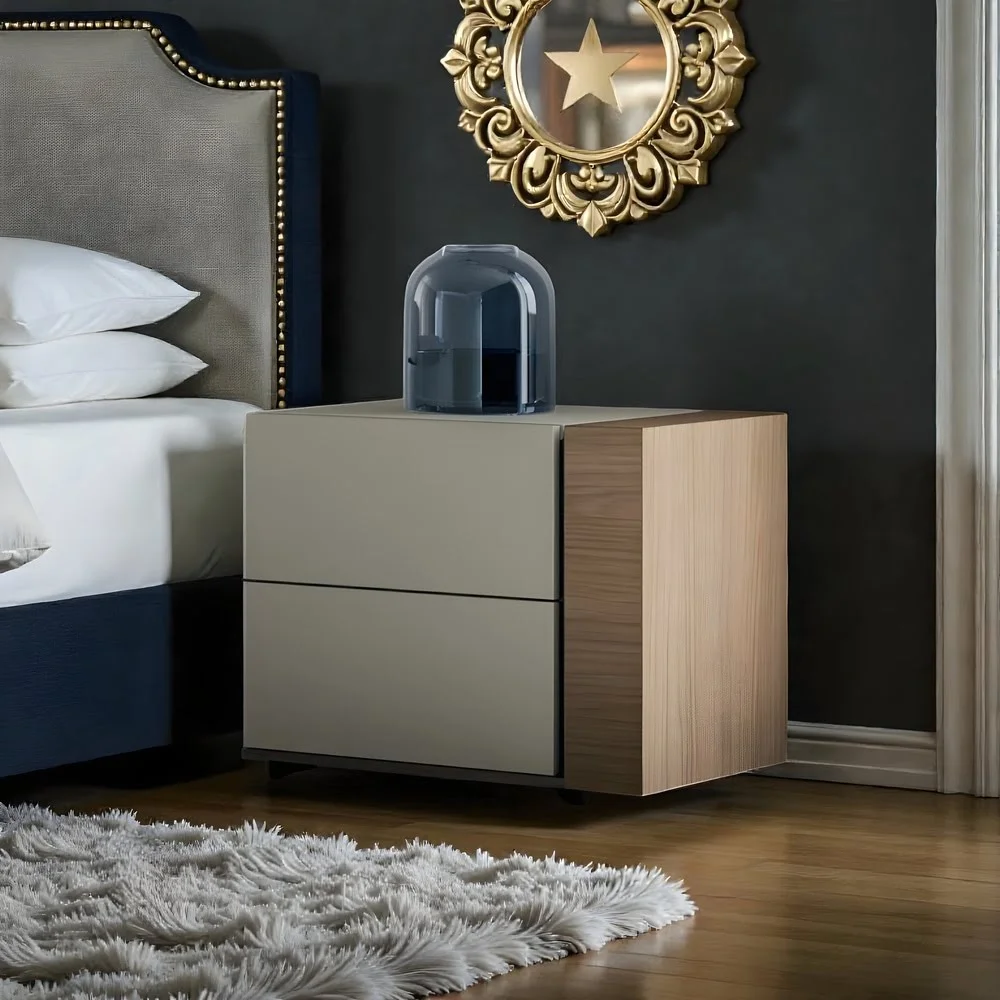 Refine your bedroom with the Accent Stripe Nightstand, a sleek modern two-tone bedside table featuring a matte taupe/beige body and drawers paired with a striking vertical light-tone accent panel on the side for subtle warmth and texture. This minimalist 2-drawer nightstand offers clean angular lines, handle-free drawers with soft-close functionality, and a generous flat top surface perfect for lamps, vases, or decor. The contrasting matte finishes create a luxurious, contemporary look that’s fingerprint-resistant and easy to maintain, blending effortlessly with modern, luxury, or transitional interiors.
