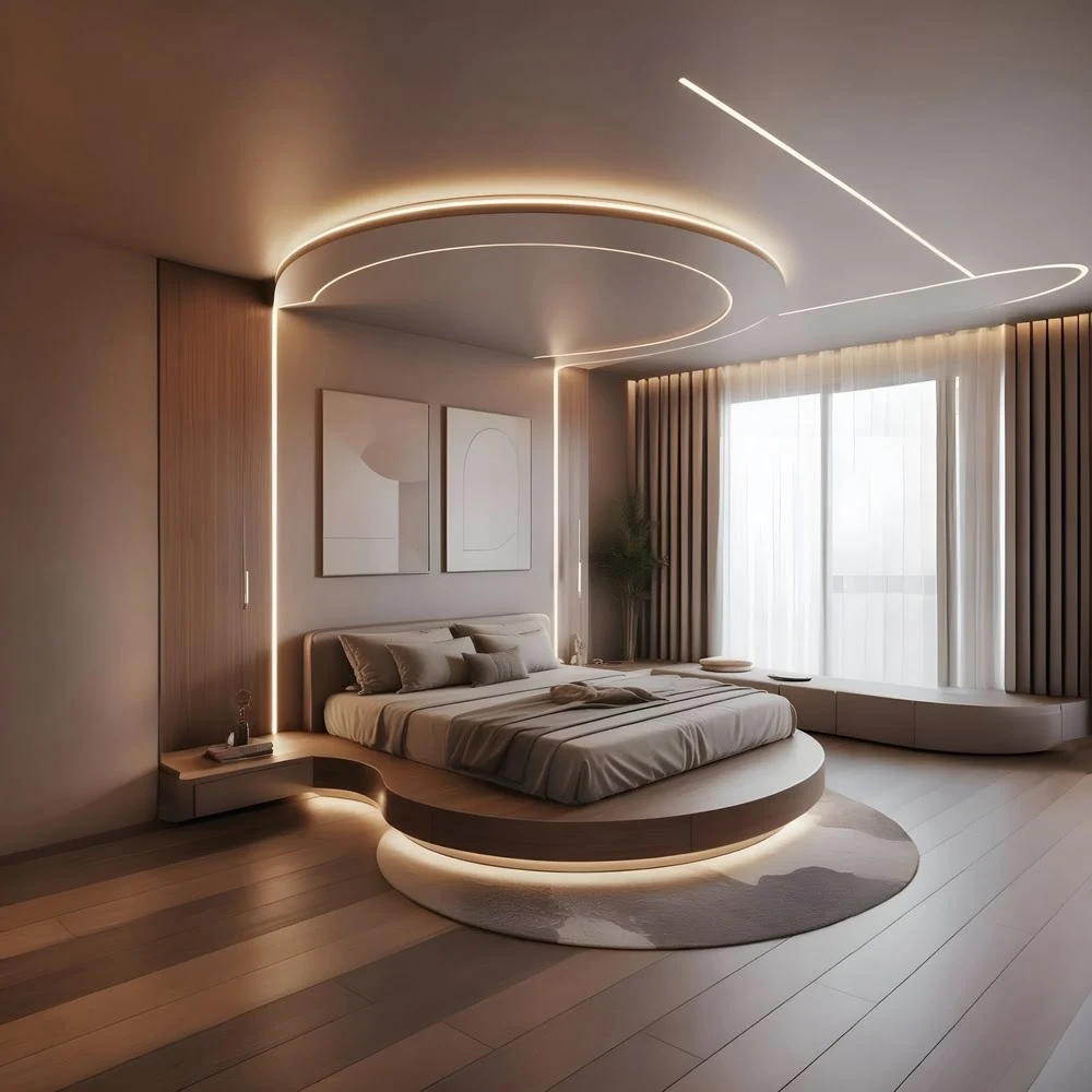 - Curved Round Platform Bed: Seamless frame in light with integrated LED strip lighting for a floating, organic aesthetic and customizable mood illumination.