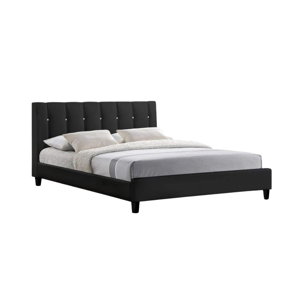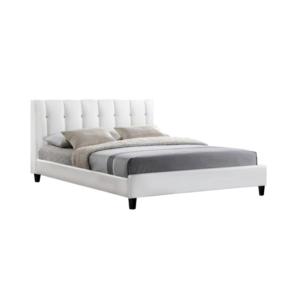 Experience restful nights and stylish décor with the Vino Modern Bed. This contemporary bed frame combines MDF with soft foam padding and sleek imitation leather in a striking black and white design. The headboard, adorned with sparkling faux crystal buttons, adds a regal touch to your bedroom.