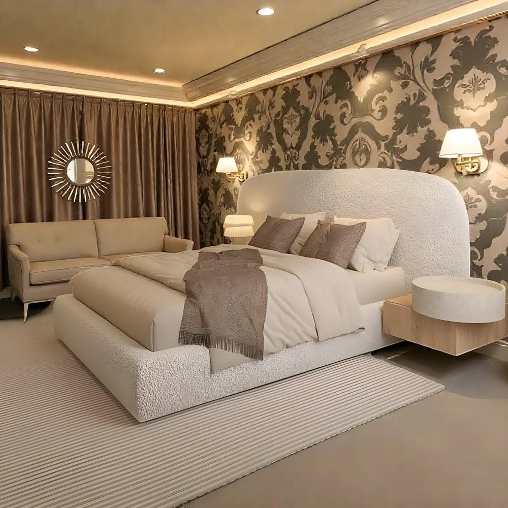 Sink into cloud-like luxury with the Cream Boucle Curve Bed – the ultimate 2025 statement bed for trendy, organic-modern bedrooms. Fully upholstered in ultra-soft cream teddy boucle fabric, this king-size masterpiece features a plush, rounded headboard with a gentle curved silhouette that wraps you in comfort. The seamless platform base and thickly padded frame create a cozy, cocoon-like feel while maintaining a clean, contemporary look. Perfect for Scandi-luxe, Japandi, or high-end minimalist interiors where texture and softness reign.