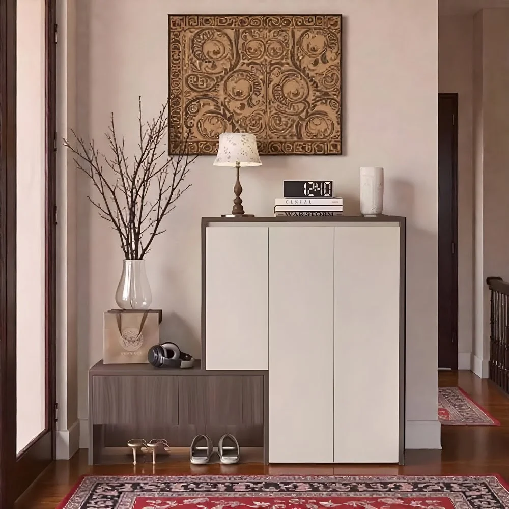 Perfect for high-traffic Dubai foyers, narrow hallways, villas, or compact apartments, this multifunctional shoe cabinet combines quiet luxury with practical organization. Aligned with 2026 trends in slim storage furniture, two-tone neutrals, and clutter-free entry solutions, it transforms messy shoe piles into effortless sophistication.