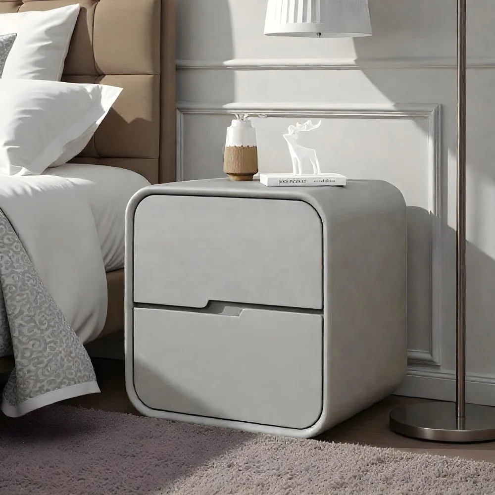 Bring refined tranquility to your bedroom with the Elegant Rounded Gray Nightstand, a sophisticated blend of soft curves and practical storage that embodies modern minimalism for serene sleep spaces. This gray bedside table showcases a gentle, rounded form in a luxurious light gray matte finish, featuring two soft-close drawers with subtle integrated pulls for discreet organization of remotes, lotions, or reading glasses. The generous top surface invites effortless styling—place a table lamp, scented candle, book, or delicate deer figurine to craft a cozy vignette that complements tufted headboards, patterned duvets, and plush rugs.