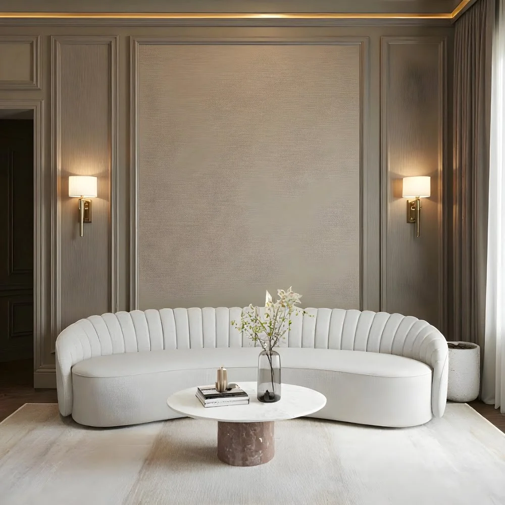 Step into refined repose with the Elysian Pleat Curved Lounge Sofa, a symphony of soft curves and subtle opulence that anchors any sophisticated sanctuary. Upholstered in a whisper-soft, light taupe fabric with meticulously pleated backs and arms that fan out like delicate waves, this single-piece wonder invites deep lounging, cradling you in timeless comfort. Gracefully positioned in a paneled greige room bathed in warm sconce light, it harmonizes with a veined offee table bearing books, a flickering candle, and ethereal white branches, all atop a plush ivory rug. Ideal for formal parlors or serene reading alcoves, the Elysian Pleat fuses Art Deco elegance with modern minimalism, turning quiet evenings into moments of pure, understated luxury.