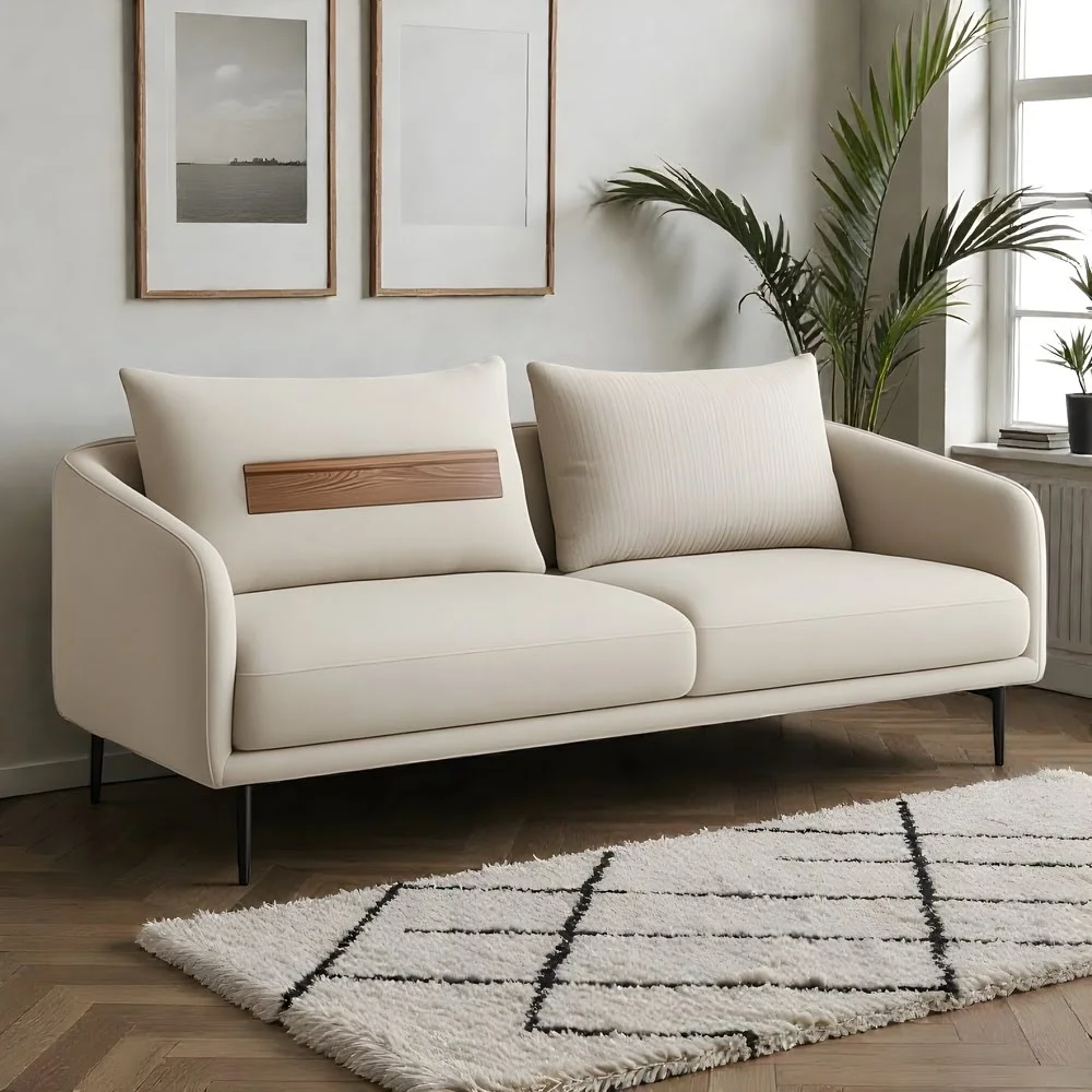 Elevate your living room with the Haven Curve Sofa — a perfect fusion of minimalist elegance and everyday comfort. This beautiful two-seater sofa in soft creamy beige fabric features gently rounded arms, plush channel-stitched back cushions, and a sleek horizontal accent bar that adds refined contrast and subtle sophistication.