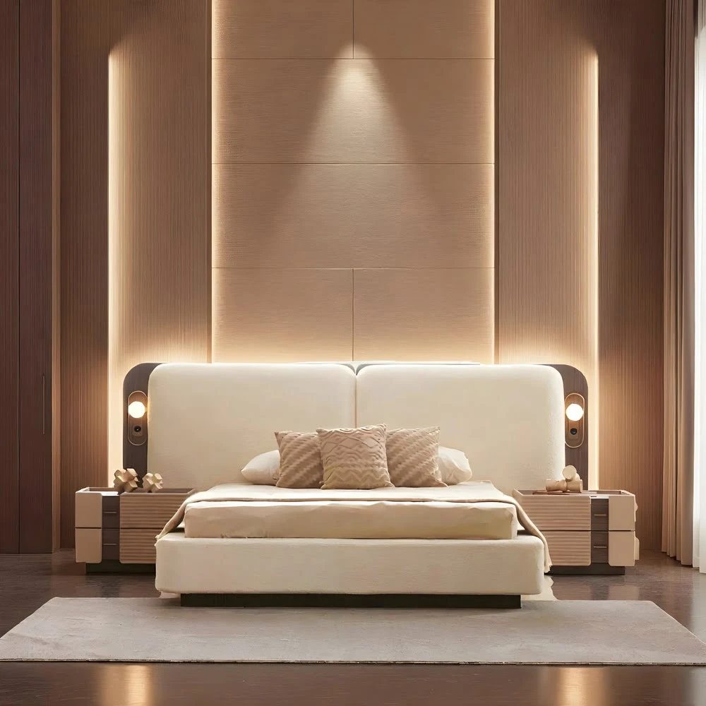 - Curved Upholstered Bed: Soft white velvet frame with ergonomic armrests and built-in diffused wall sconces; platform style for seamless mattress integration.