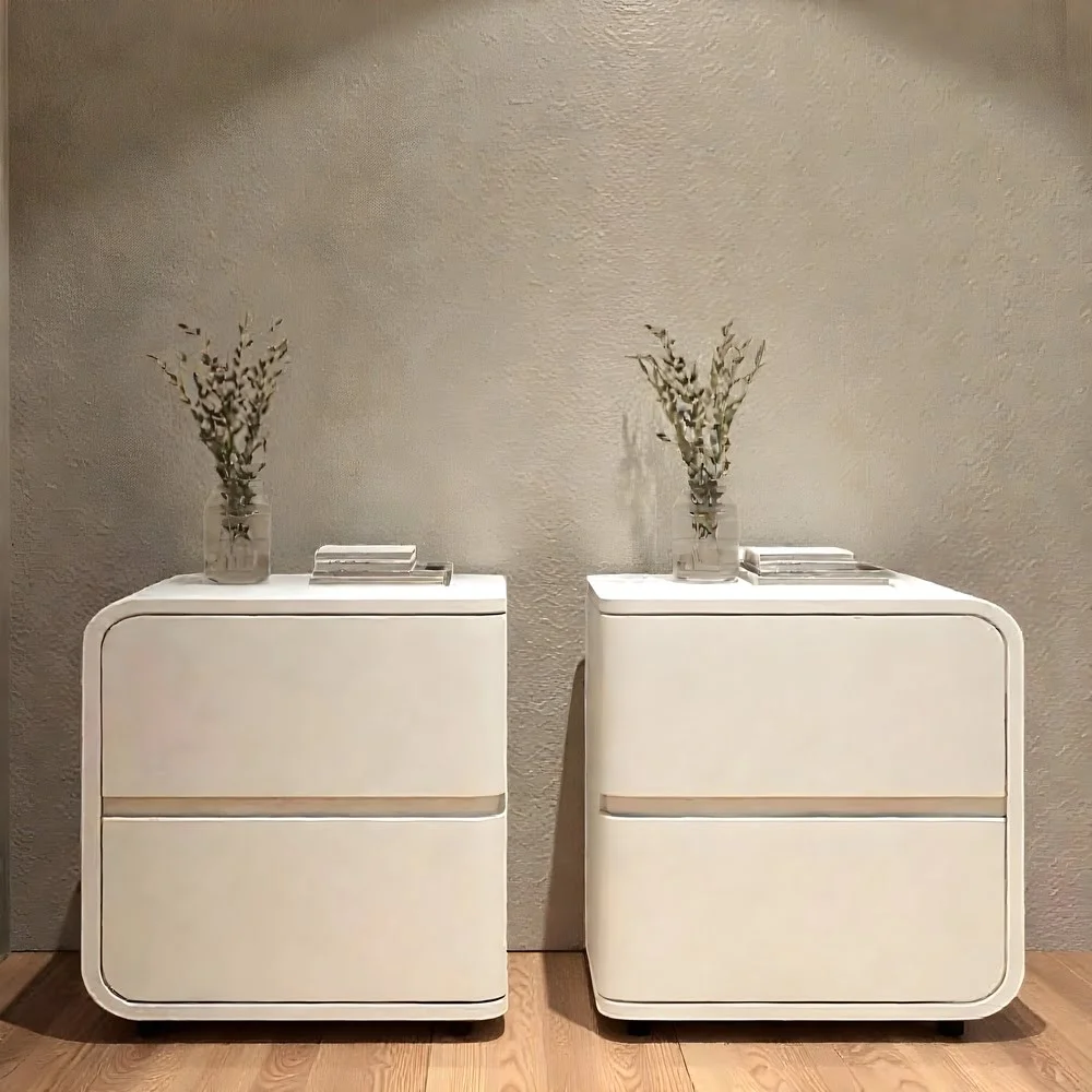 Create a tranquil bedroom retreat with the Modern Rounded White Nightstand, a minimalist gems that fuse soft curves and clever storage for effortless contemporary style. This white bedside table features a sleek, rounded silhouette in a pristine matte white finish, with two soft-close drawers accented by subtle horizontal pulls—ideal for tucking away remotes, jewelry, or skincare while keeping your surface clutter-free. The generous top welcomes your favorite accents, like slim vases with dried pampas grass, stacked books, or a glowing lamp, crafting a serene vignette against neutral walls and floors.