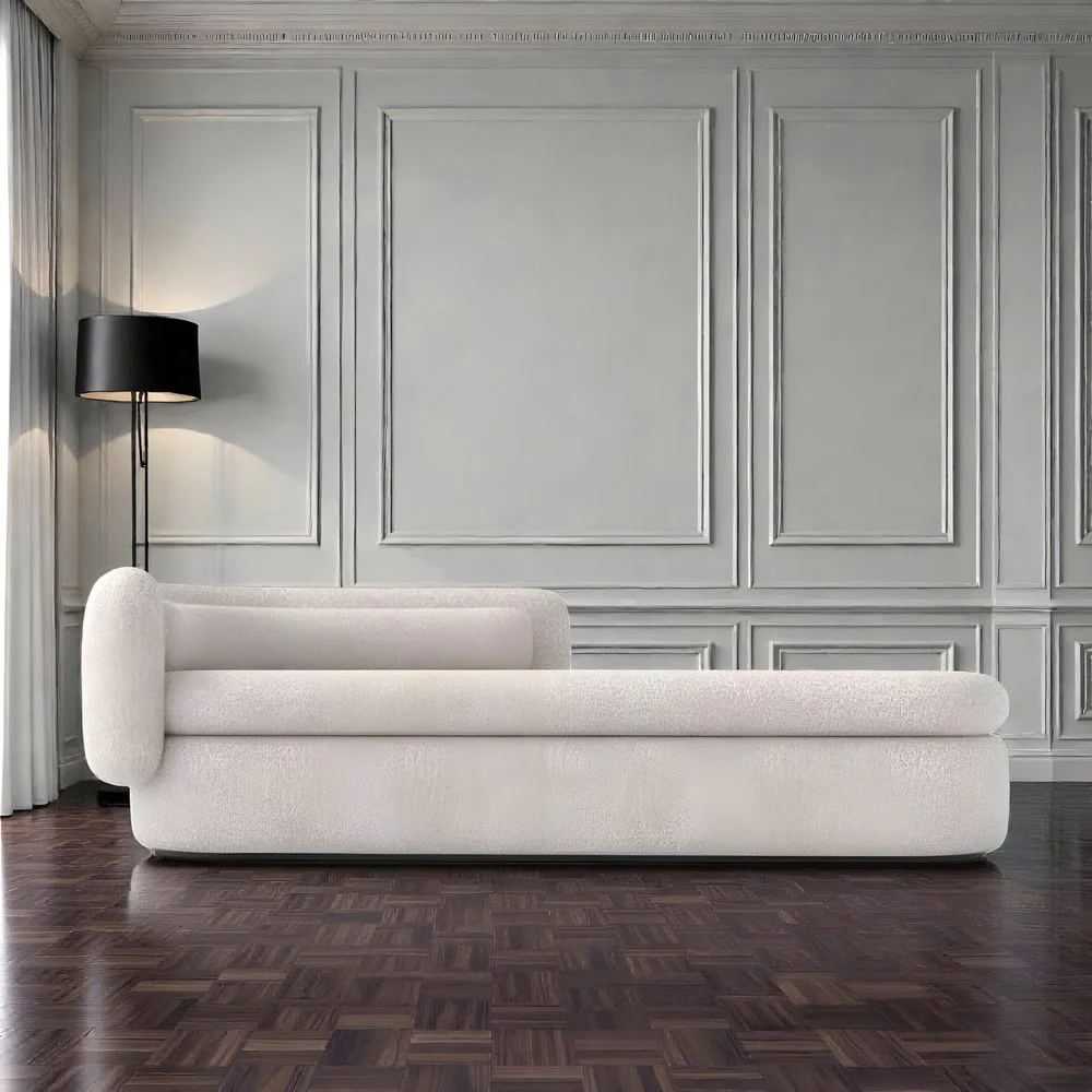 The low-profile silhouette and seamless, boneless design deliver a minimalist yet opulent aesthetic that pairs beautifully with paneled walls, herringbone floors, neutral palettes, and luxury accents. Perfect as a statement piece in living rooms, open-plan areas, master suites, or villa lounges, it offers generous seating for one to two people while maintaining an airy, spacious feel. Aligned with 2026 trends in boucle textures, curved furniture, and serene neutrals, the Nimbus brings hotel-inspired luxury and tactile elegance to everyday living.