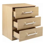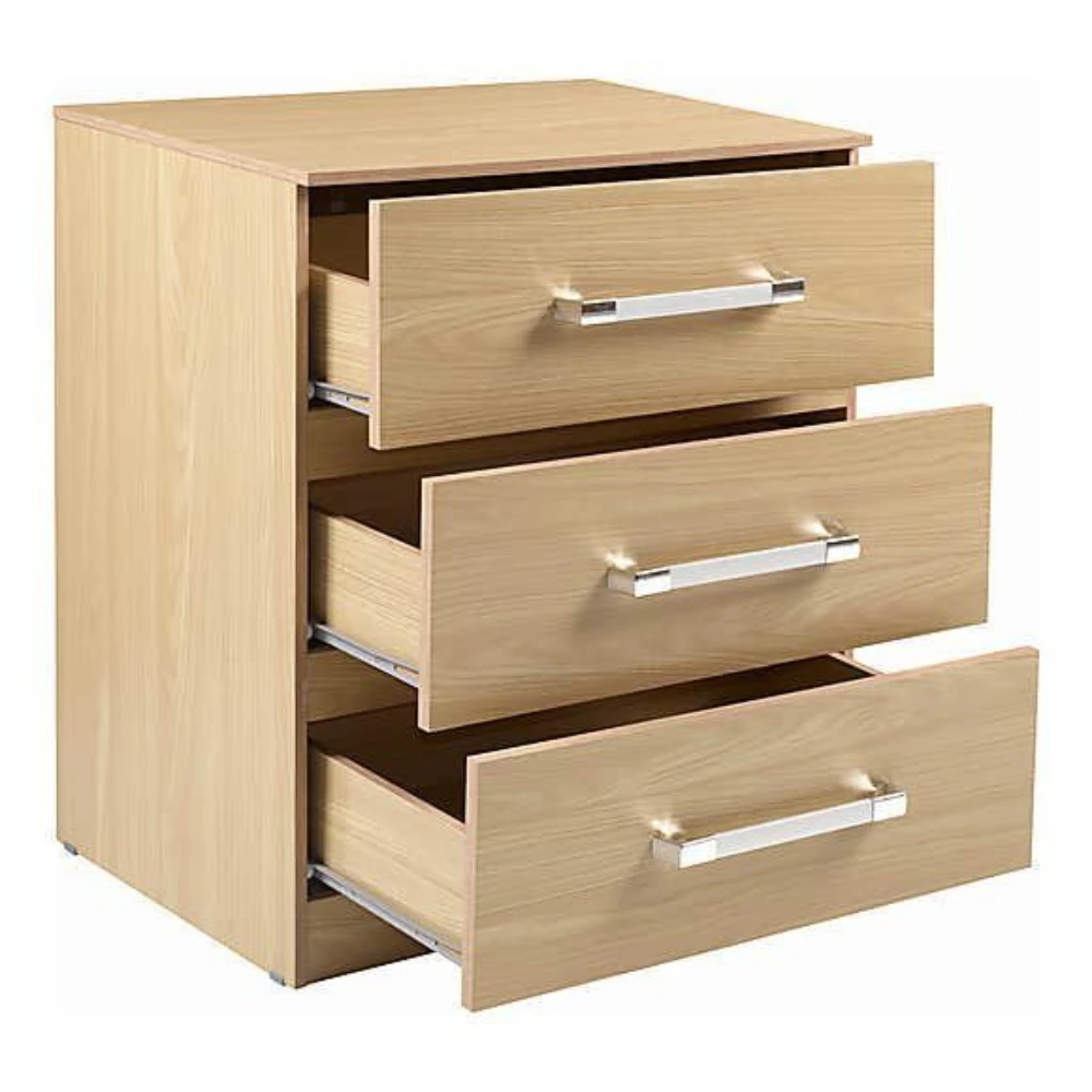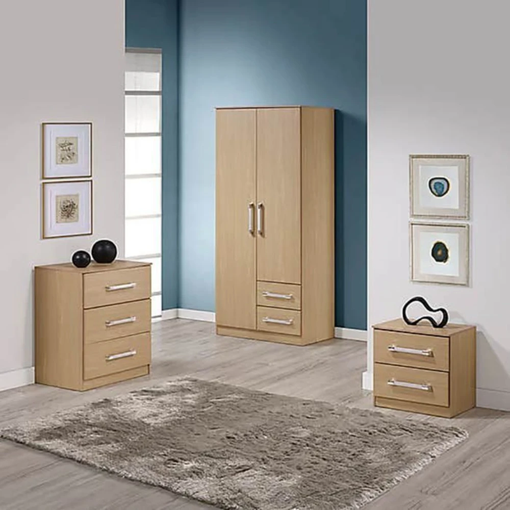 The Jasper bedroom set adds a fresh touch to any space with its modern style. This chic and functional set includes a three-drawer chest, a three-door wardrobe with two drawers, and a bedside table featuring two drawers, all accented with stylish chrome knobs.