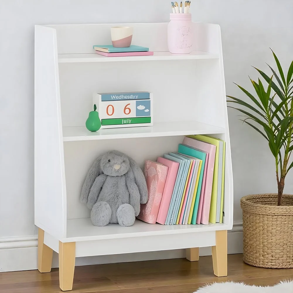 Delight your little one with the Scandi Curve Kids Bookshelf, a charming white children’s bookcase elevated on natural light-tone tapered legs, featuring three open shelves with softly curved sides for a gentle, modern Scandinavian look. This toddler-friendly bookshelf offers ample space to display favorite books front-facing on the lower shelf, toys, stuffed animals, or decor on the upper levels, encouraging independent reading and tidy play. The crisp white matte finish brightens nurseries or playrooms, while the sturdy raised legs add stability, airflow, and easy cleaning underneath. Crafted with smooth rounded edges for safety and durable materials for everyday use, this versatile open shelving unit blends minimalist style with practical storage. I