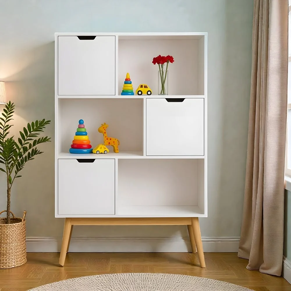 • Asymmetric Layout: Unique staggered design with three cabinet doors for concealed storage and open shelves for easy-access display of toys, books, or favorites.
