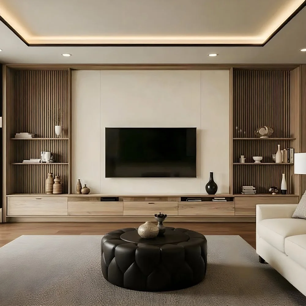 Transform your living space with the Scandinavian Slat TV Wall, a masterpiece of minimalist elegance and practical design for modern homes. This slat TV unit boasts vertical slats flanking a serene beige textured wall, creating a cozy yet sophisticated backdrop that diffuses soft light beautifully. Flanked by open floating shelves adorned with books, ceramic vases, and lush greenery, it offers endless styling possibilities while the integrated recessed ceiling LED lighting casts a warm, inviting glow over the entire setup.