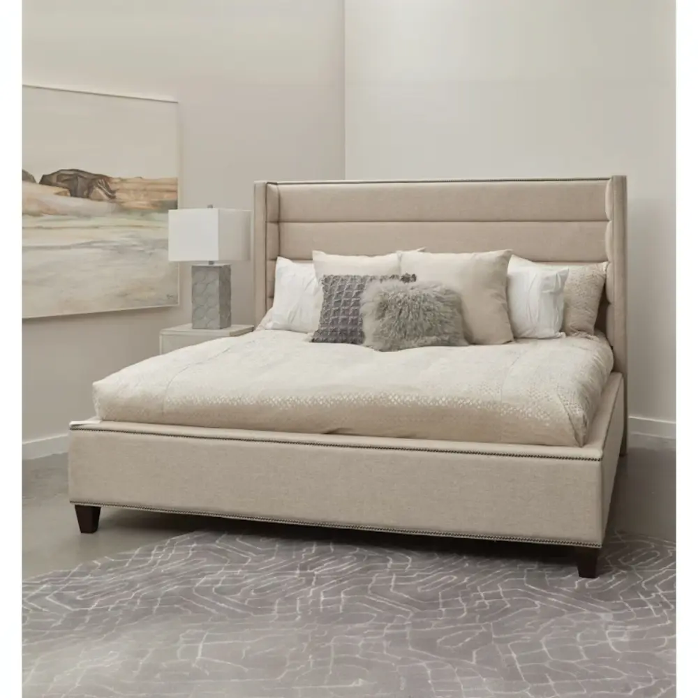 Transform your sleeping space with this captivating shelter-style bed, elegantly wrapped in a soft beige fabric and adorned with horizontal channeling. The channel tufting flows beautifully onto the block-edged wings of the headboard, while the delicate burnished brass nailhead trim adds a touch of sophistication. The low-profile footboard, resting on dark-finished legs, offers a stylish contrast, and matching nailhead accents along the footboard and side rails tie the design together seamlessly.