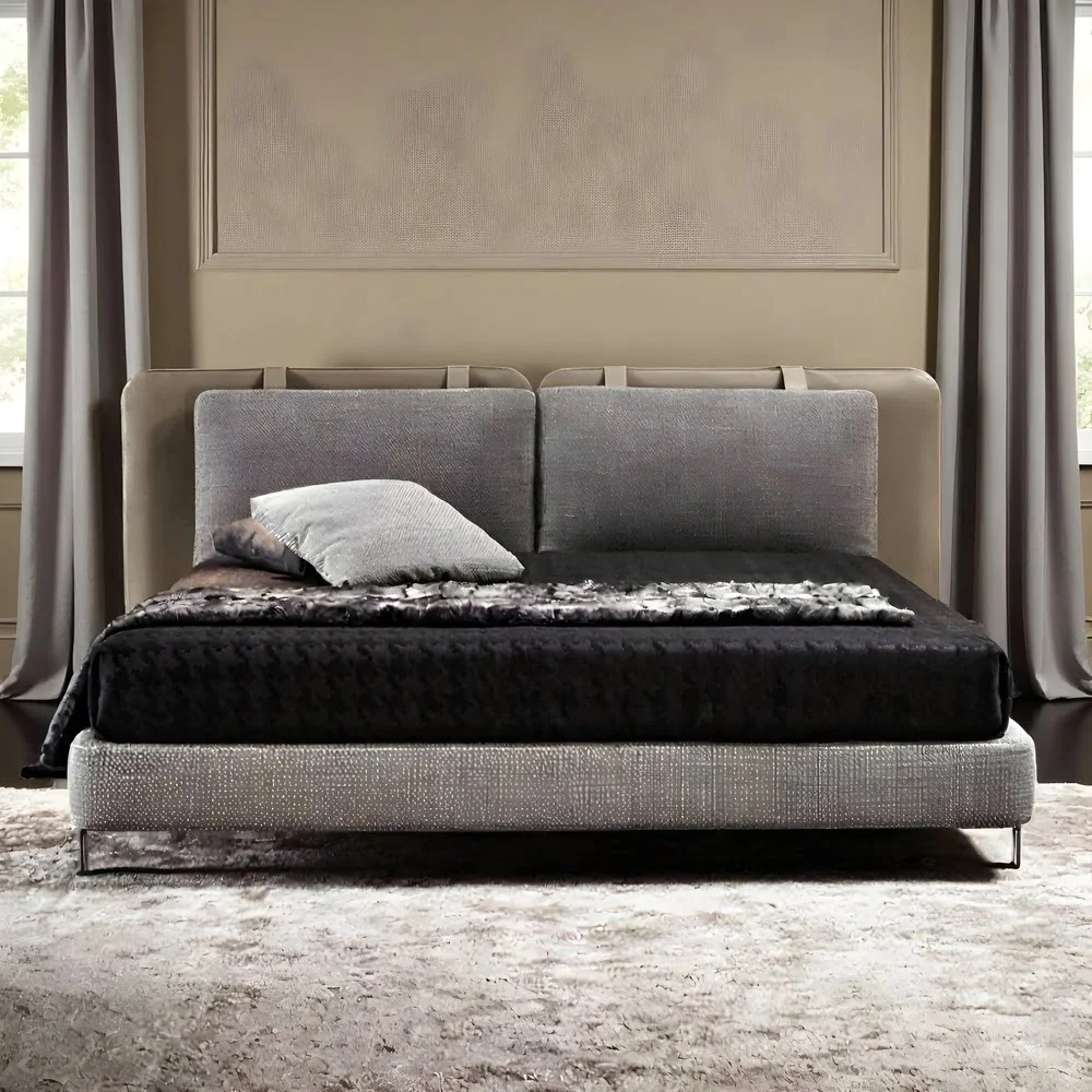 - Low-Profile Platform Bed: Gray upholstery on all sides; no box spring required, with slim chrome legs for airy elevation.