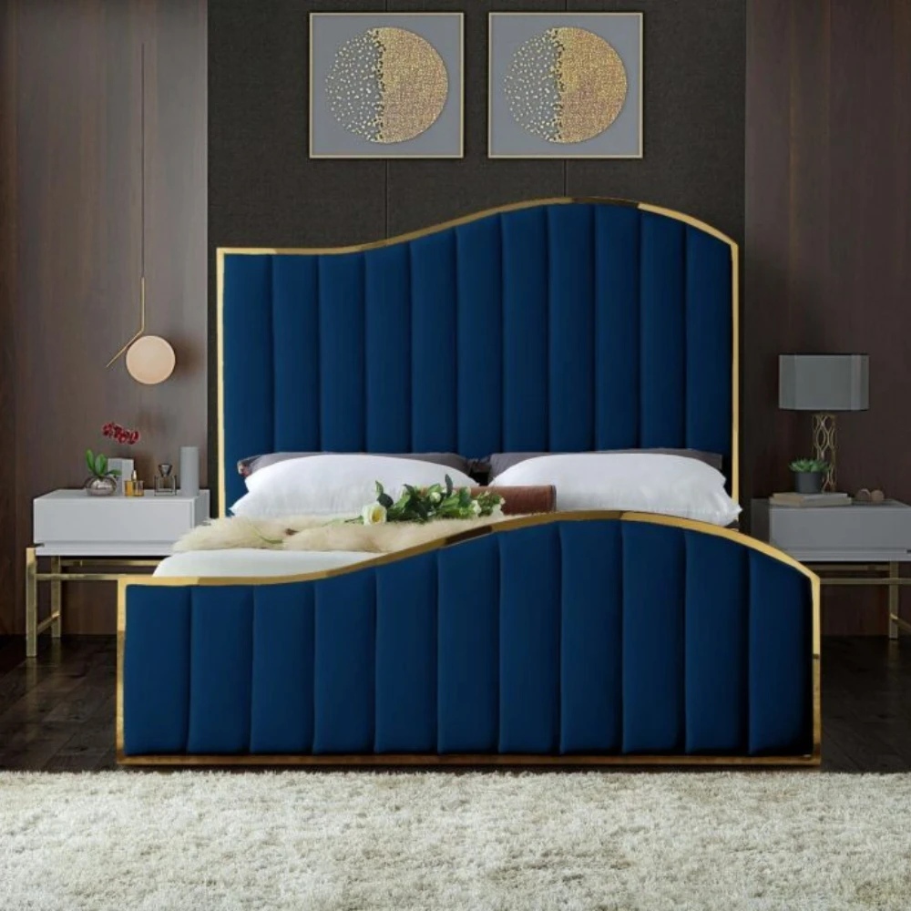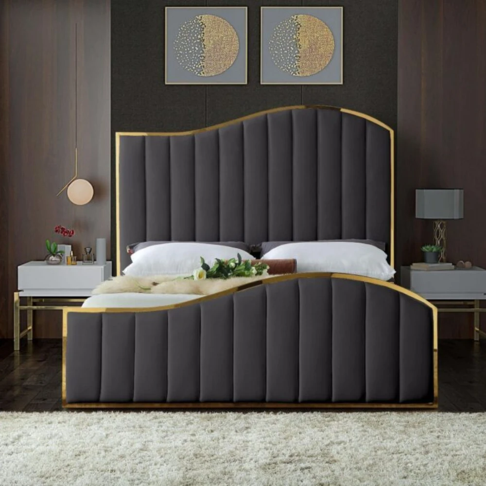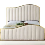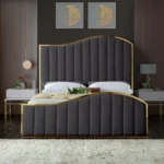 Transform your bedroom into a dream retreat with this stunning cream velvet king size bed. Not only does it capture attention, but it also elevates your space with its modern design. The bed features a striking polished gold metal frame that beautifully complements the plush cream velvet upholstery, adorned with channel tufting for added texture. The headboard and footboard’s wave-like design evokes the serene image of waves gently rolling at sea, promising restful nights and sweet dreams.